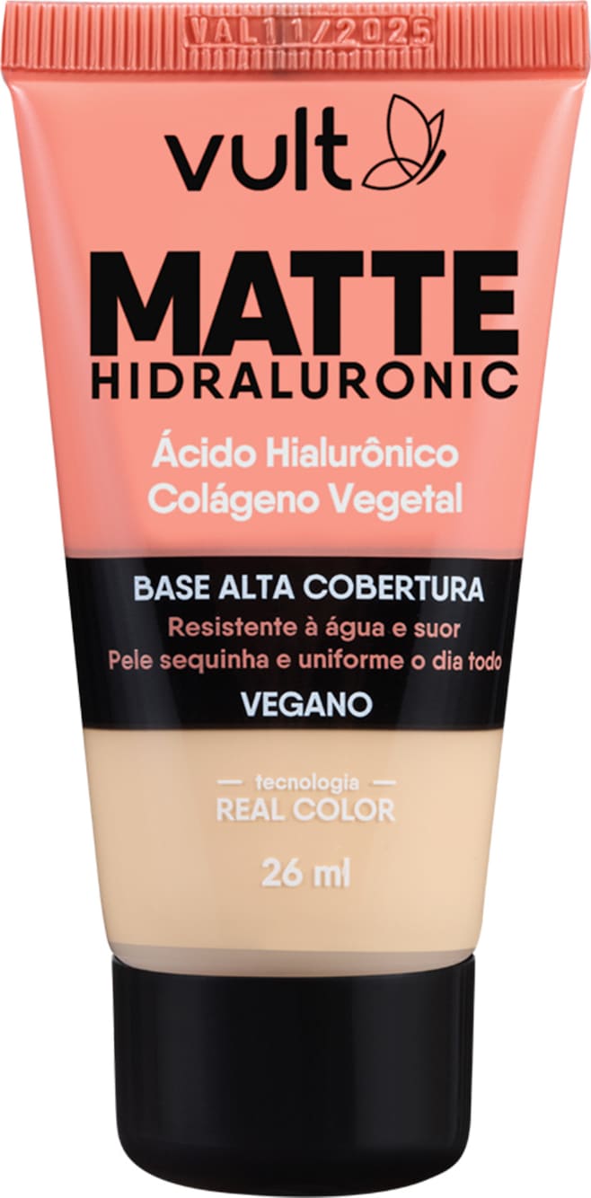 Inovadora, a Base Matte Hidraluronic Vult V150 contém Ácido Hialurônico, conhecido por deixar aquela sensação de pele hidratada, e Colágeno Vegetal garantindo alta cobertura e efeito matte confortável que não resseca a pele.