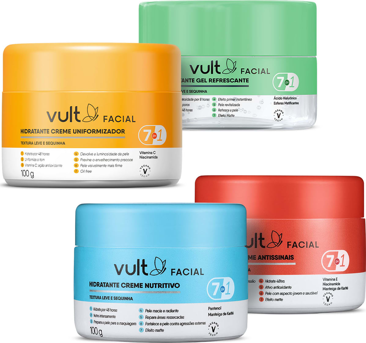 O Creme Potinho Hidratante Facial Vult Care Nutritivo fortalece a barreira de proteção natural da pele, auxilia na proteção contra agressões cotidianas e repara áreas ressecadas. Com Pantenol e Manteiga de Karité, possui textura leve e oil free que auxilia na redução das rugas e linhas finas.