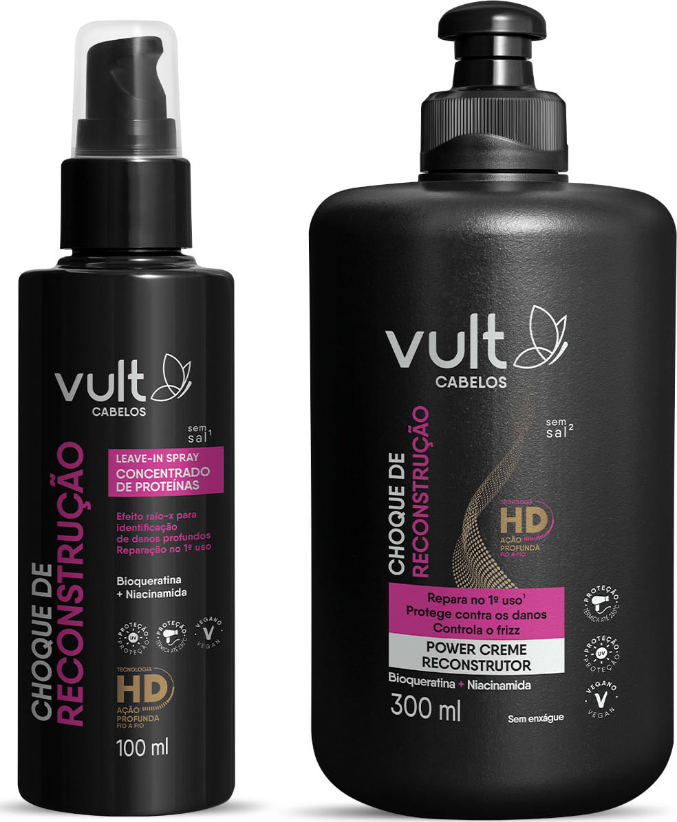 O Leave-In Spray Vult Cabelos Choque de Reconstrução opera de forma inteligente por meio do Efeito Raio X, este Leave-In detecta danos profundos, repõe proteínas capazes de recuperar fios danificados pelos processos químicos. Sem deixar os fios enrijecidos, sela a cutícula e facilita a escovação, além de mais benefícios: