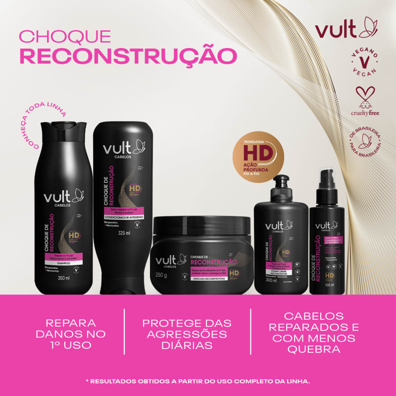 O Power Creme Reconstrutor Vult Cabelos Choque de Reconstrução pode ser usado como um creme de pentear, este item sela as cutículas e forma um filme protetor que garante fácil desembaraço e redução da quebra dos fios. Confira mais benefícios: