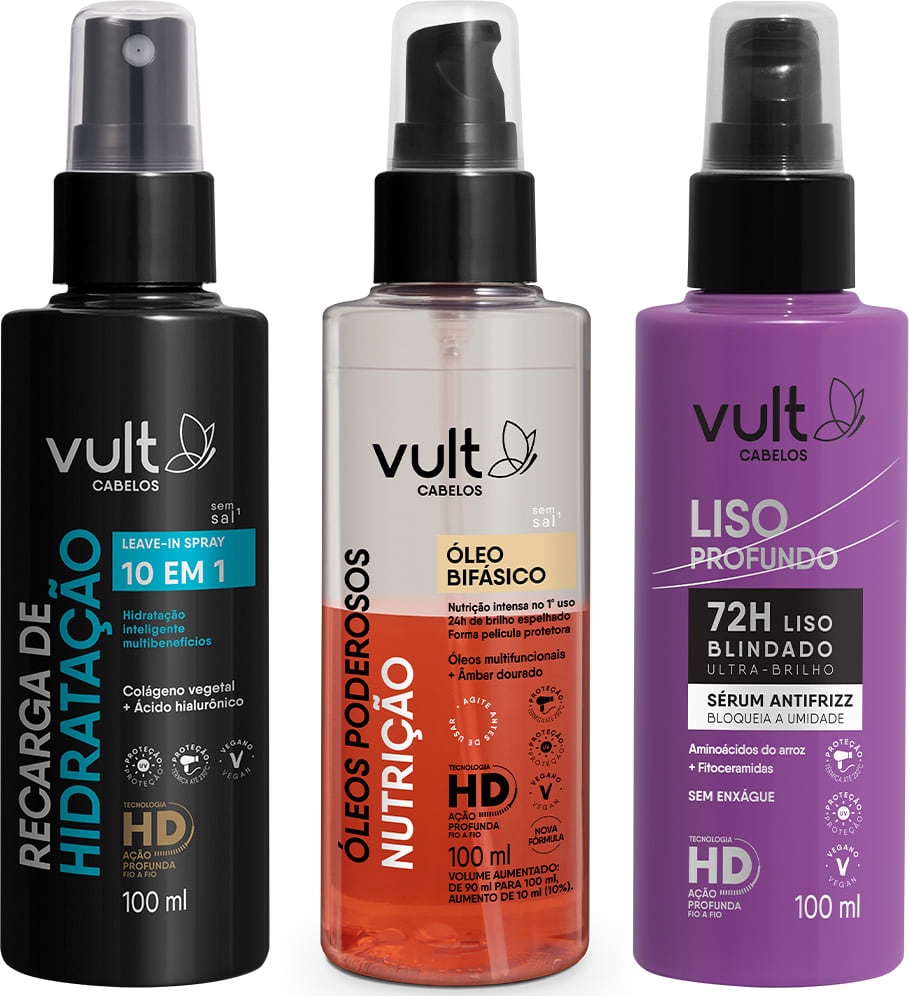 Combo Finalização Vult Cabelos: Sérum Antifrizz 100ml + Óleo Bifásico 90ml + Leave-In 10 em 1 100ml