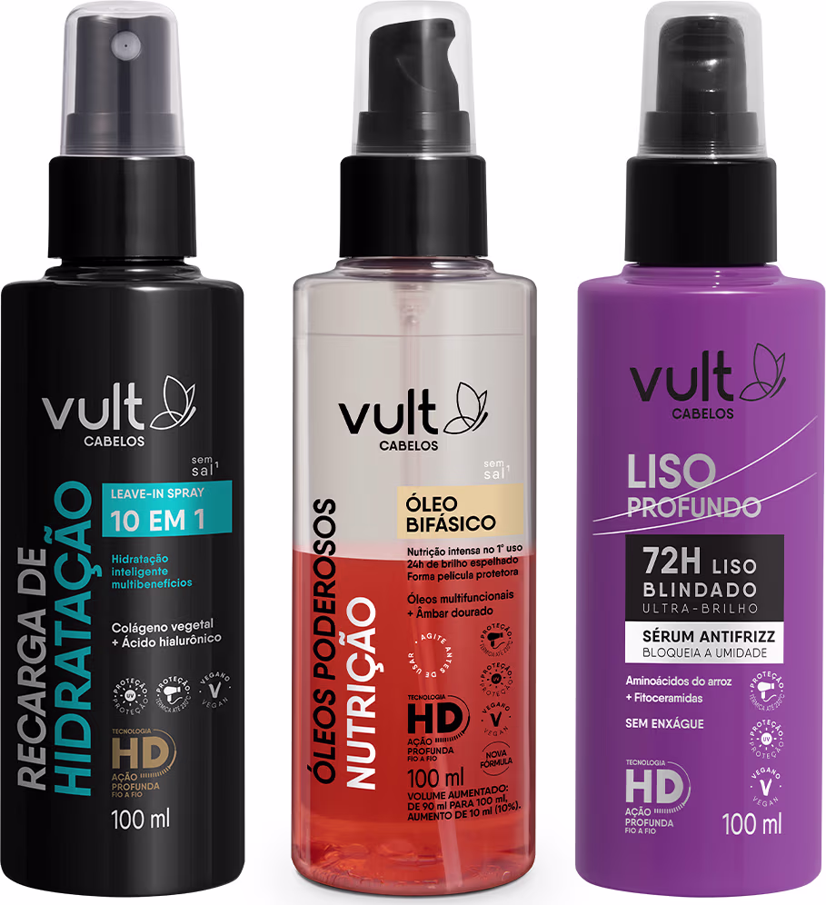 Combo Finalização Vult Cabelos: Sérum Antifrizz 100ml + Óleo Bifásico 90ml + Leave-In 10 em 1 100ml