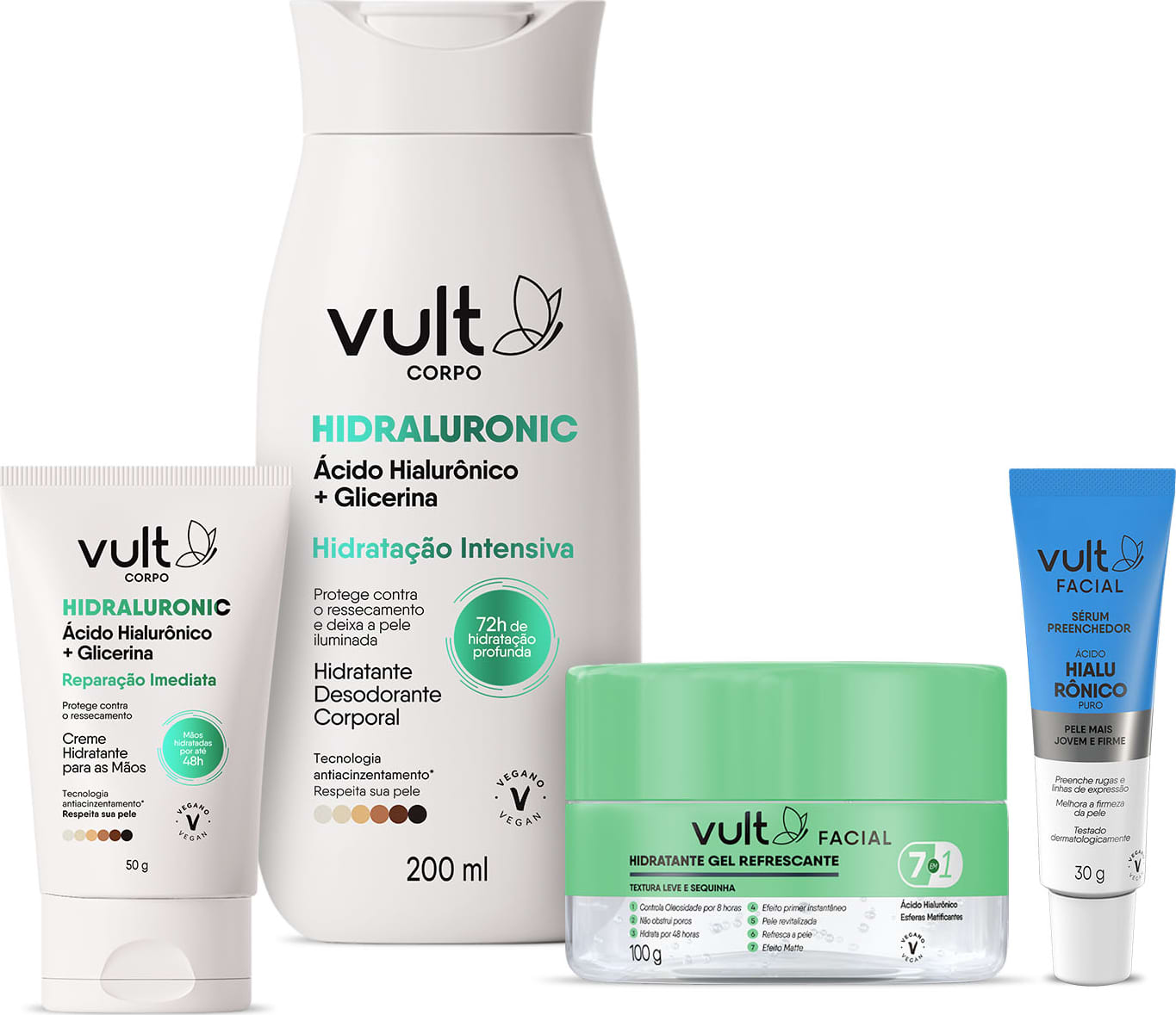 O Hidratante Desodorante Corporal Vult Corpo Hidraluronic Hidratação Intensiva proporciona hidratação para o corpo ao combinar Ácido Hialurônico e Glicerina: dois ativos reconhecidos pelo alto poder de hidratação. Com Tecnologia Antiacinzentamento, promove reparação profunda e previne o aspecto cinza da pele.