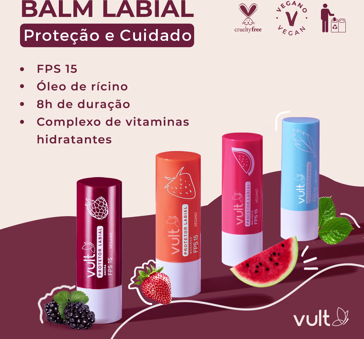 O Vult Balm Melancia - Protetor Labial é um protetor labial com FPS 15. Vult Balm proporciona lábios super protegidos, além de intensamente hidratados. Formulado com Óleo de Rícino e um Complexo de Vitaminas Hidratantes, garante lábios extremamente macios, protegidos e rejuvenescidos.
