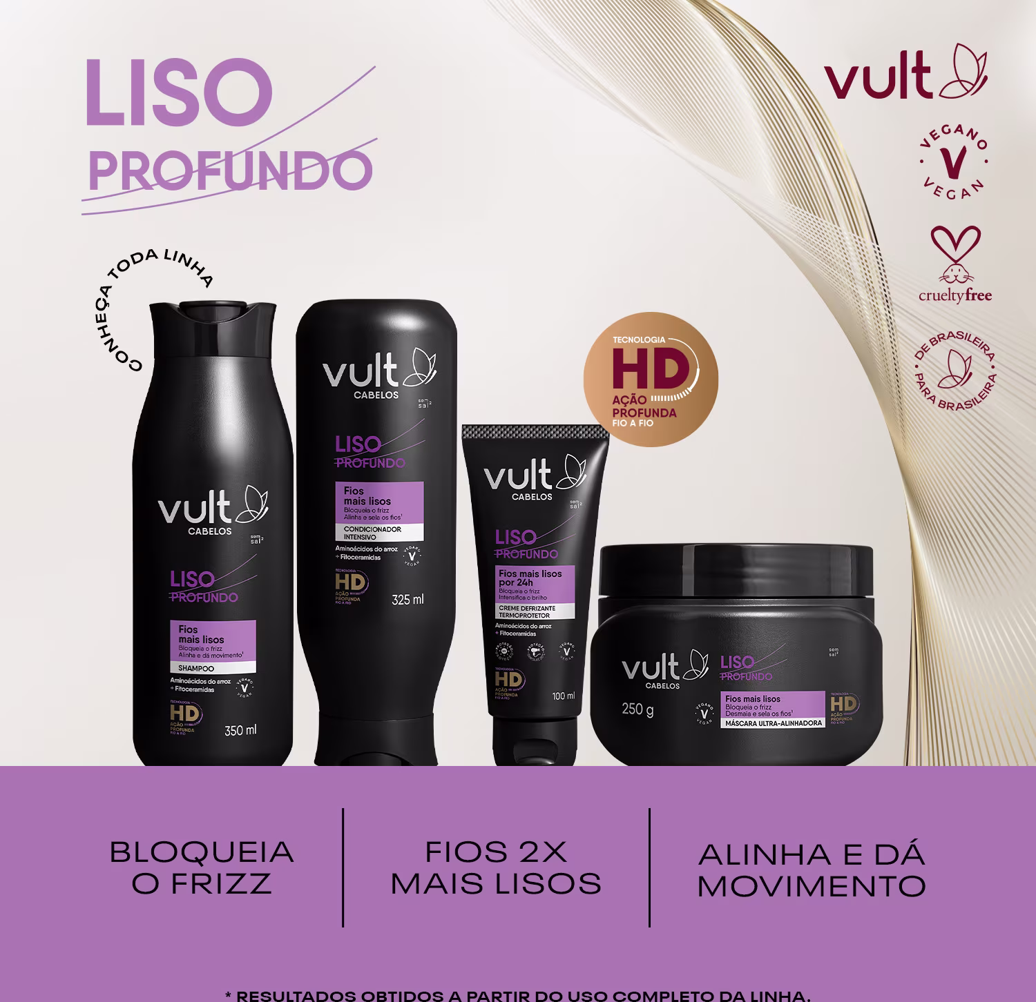 Com nova fórmula desenvolvida com Tecnologia HD, que é um sistema inteligente composto por aminoácidos reconhecidos pelo alto potencial reparador que agem profundamente fio a fio, o Combo Vult Cabelos Liso Profundo traz itens que valorizam seu cabelo e te incentivam a cuidar dos seus fios, manifestando a beleza única que eles têm: