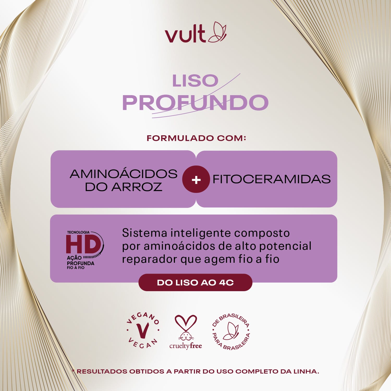 Com nova fórmula desenvolvida com Tecnologia HD, que é um sistema inteligente composto por aminoácidos reconhecidos pelo alto potencial reparador que agem profundamente fio a fio, o Combo Vult Cabelos Liso Profundo traz itens que valorizam seu cabelo e te incentivam a cuidar dos seus fios, manifestando a beleza única que eles têm: