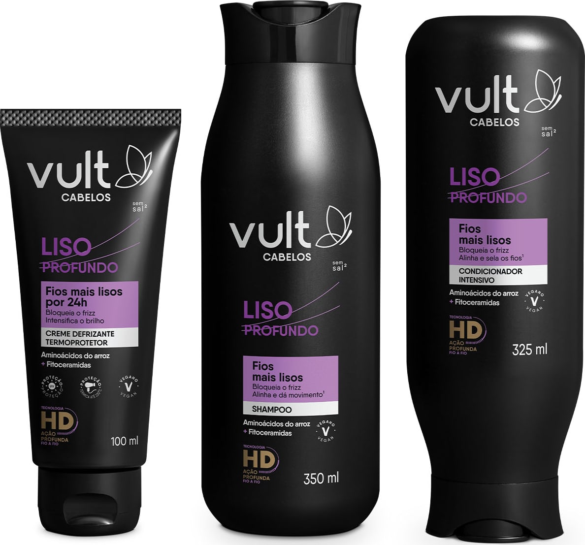 Combo Vult Cabelos Liso Profundo: Shampoo 350ml + Condicionador 325ml + Creme Defrizante Termoprotetor 100ml