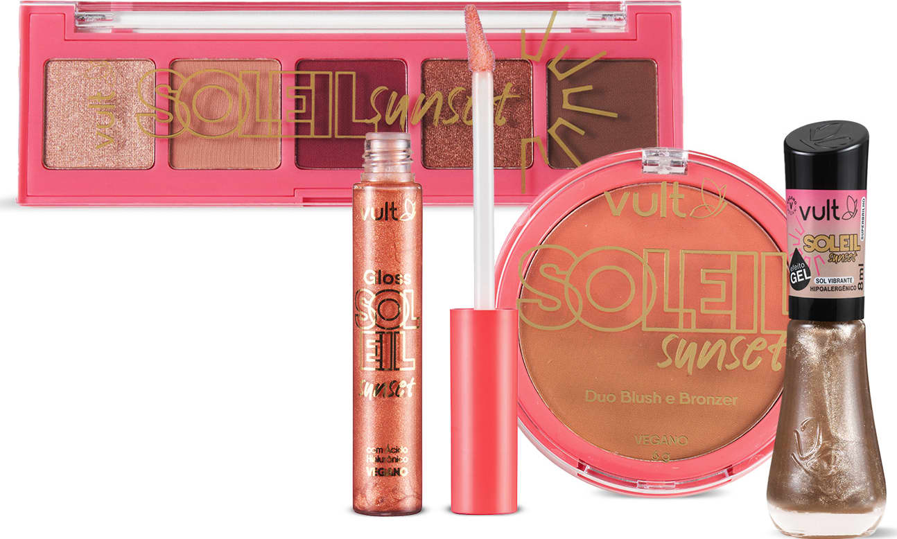 O Combo Vult Soleil Sunset Vibrante traz o brilho do verão para iluminar suas produções e looks. Com um gloss labial, uma paleta de sombra, um pó compacto duo e um esmalte incrível, este combo é ideal para você montar uma produção completa cheia de brilho, cor e estilo: