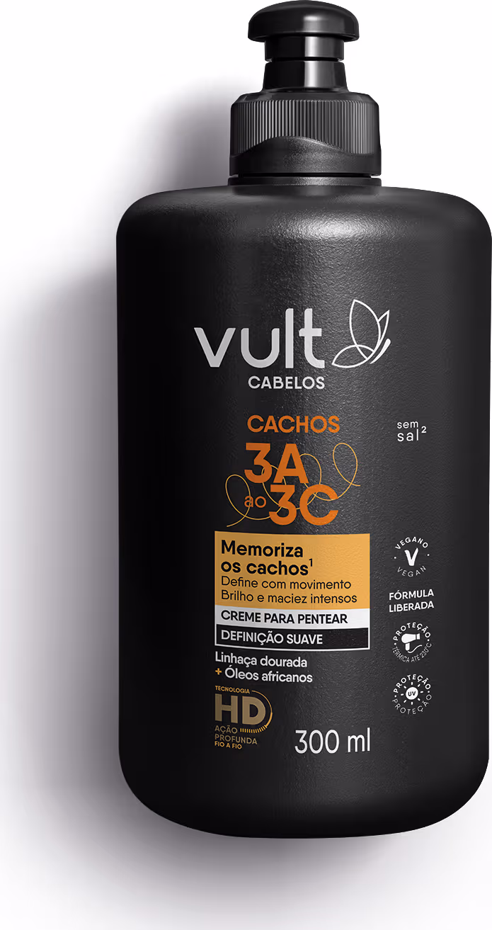 O Creme de Pentear Vult Cabelos Cachos 3A a 3C entrega definição suave, garantindo fios soltos, com movimento e brilho, todos os dias.