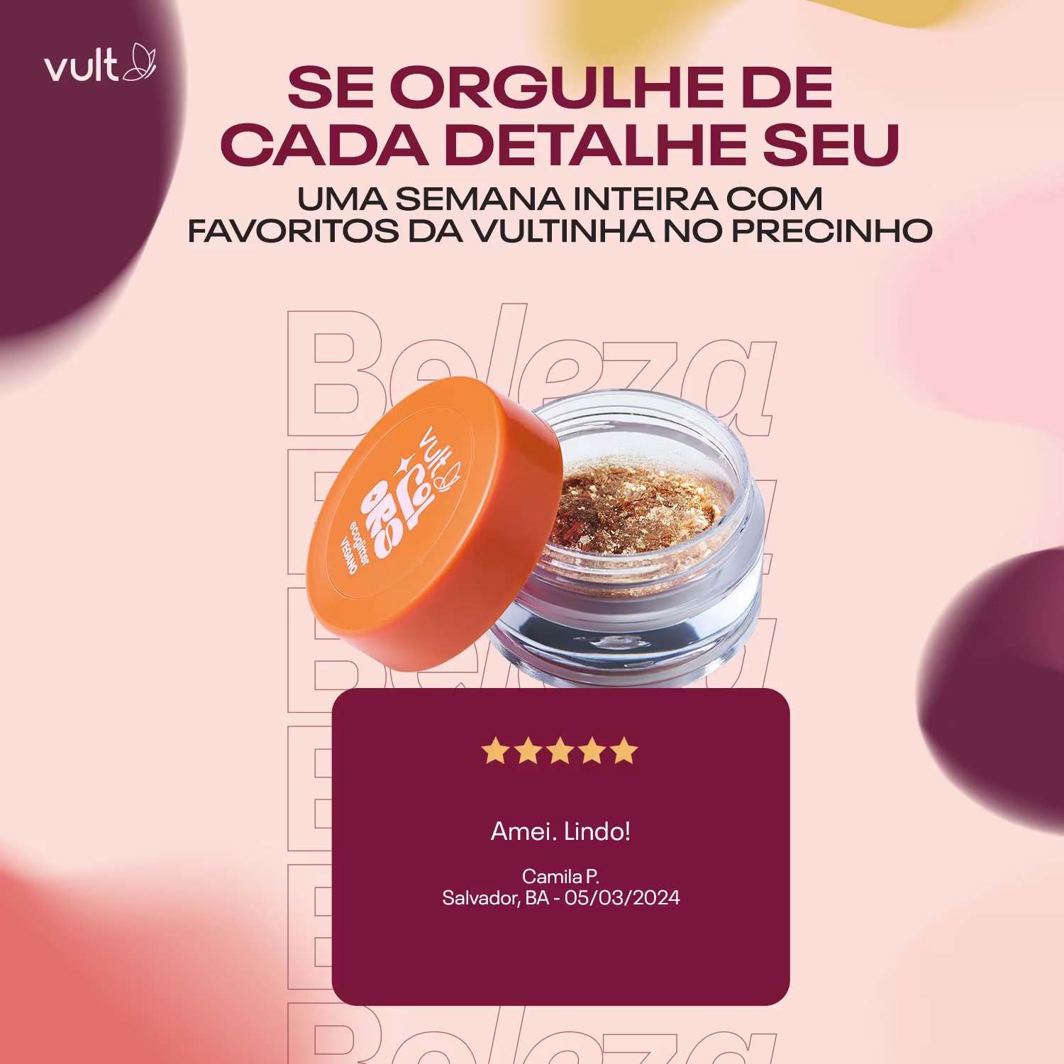 Para brilhar a todo momento, o Ecoglitter Multifuncional Vult Colors traz um brilho intenso e sustentável. Ver mais ❯