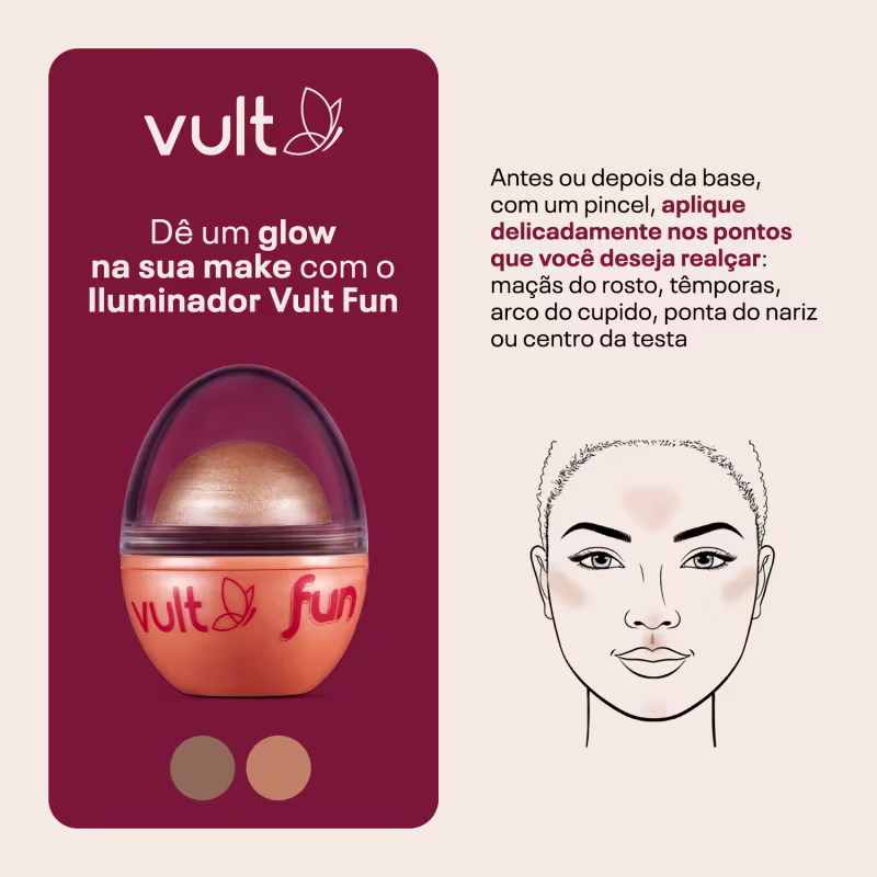 O Iluminador 3 em 1 Vult Fun Rosé Iluminada destaca e ilumina seu rosto dando efeito de pele radiante e divertida.