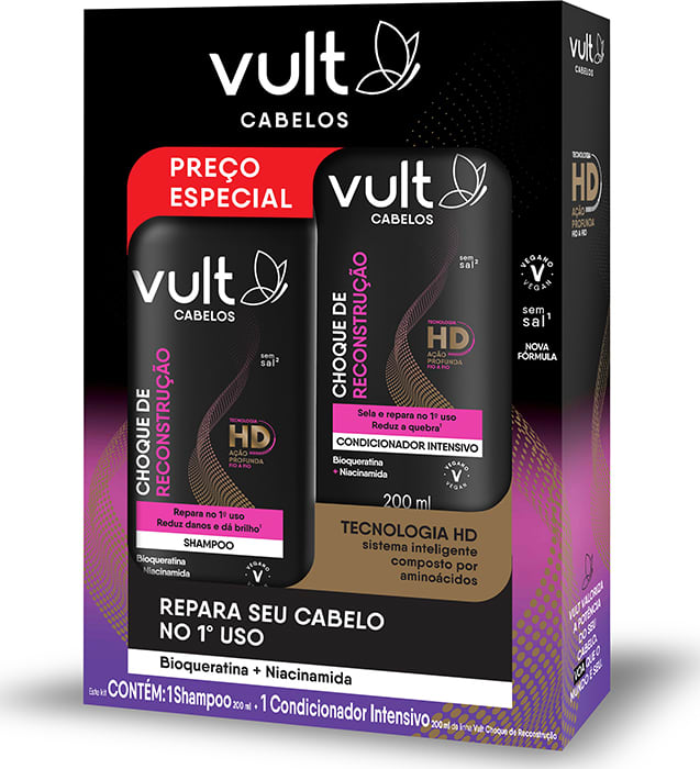 Vult Cabelos Choque de Reconstrução valoriza seu cabelo e te incentiva a cuidar dos seus fios, manifestando a beleza única que eles têm. O Kit Vult Cabelos Choque de Reconstrução traz a Tecnologia HD e proporciona tratamento em casa para fios reparados, com menos danos e cheios de brilho desde o 1º uso ¹: