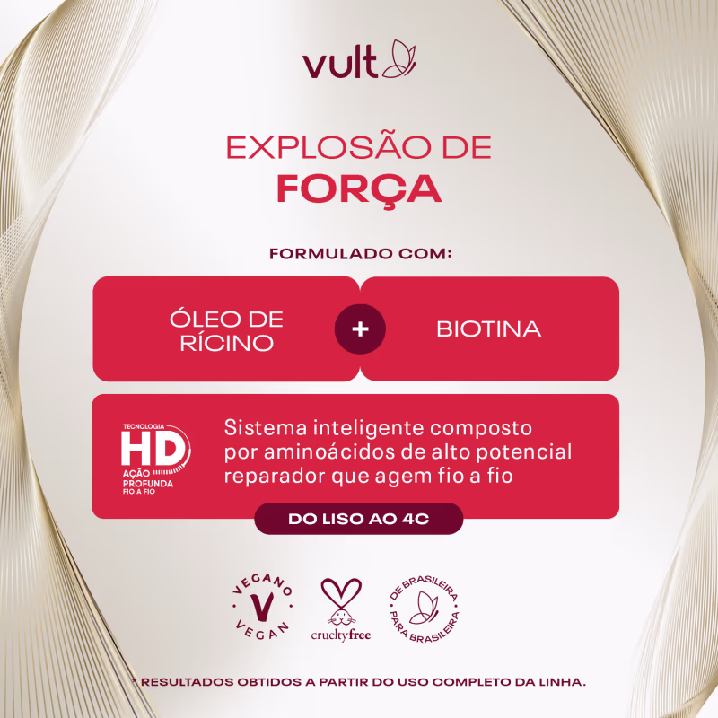 Com nova fórmula desenvolvida com Tecnologia HD, que é um sistema inteligente composto por aminoácidos reconhecidos pelo alto potencial reparador que agem profundamente fio a fio, a linha Vult Cabelos Explosão de força te deixa pronta e confiante para desbravar o mundo!