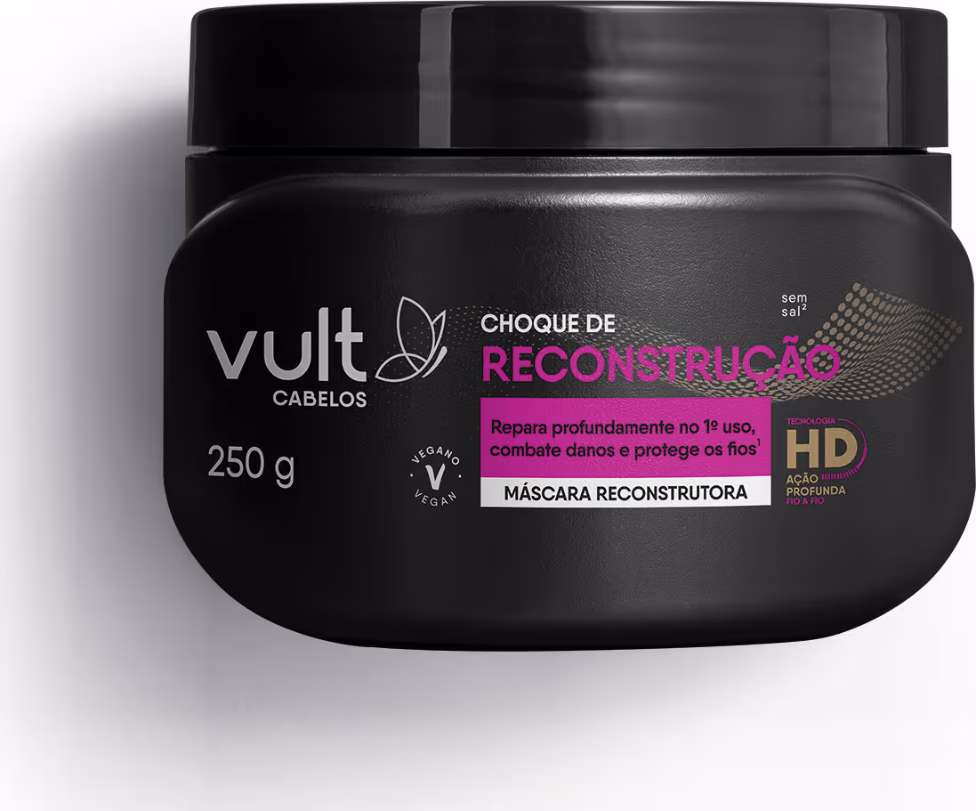 A Máscara Reconstrutora Vult Cabelos Choque de Reconstrução repara no 1º uso, combate danos e protege os fios. Ver mais ❯