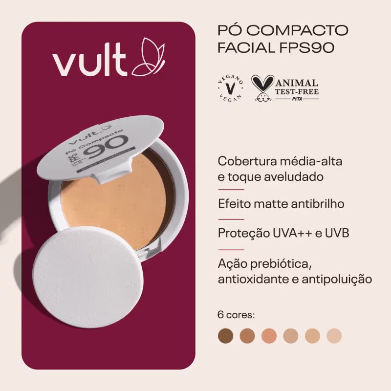 Este pó compacto Vult FPS 90 possui proteção UVA++ e UVB, cobertura média alta e efeito mate antibrilho, que proporcionam uma pele com acabamento natural e uniforme.
