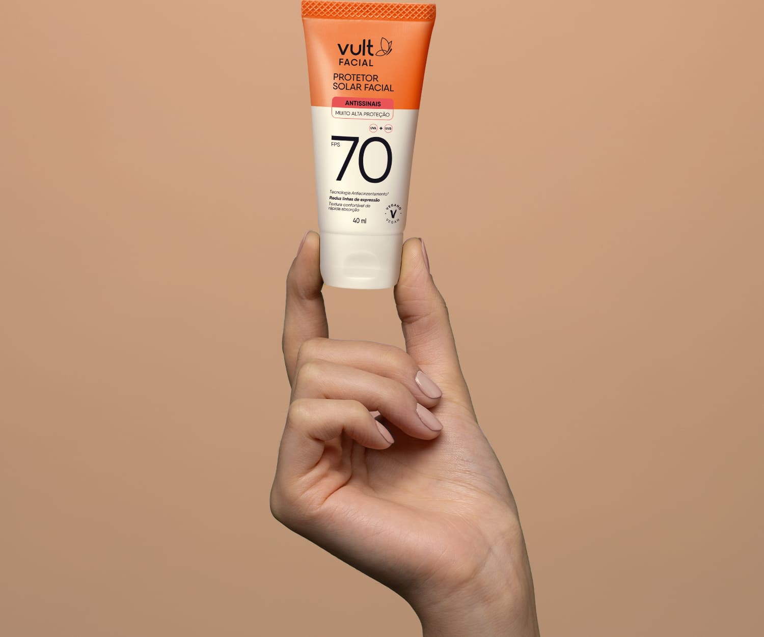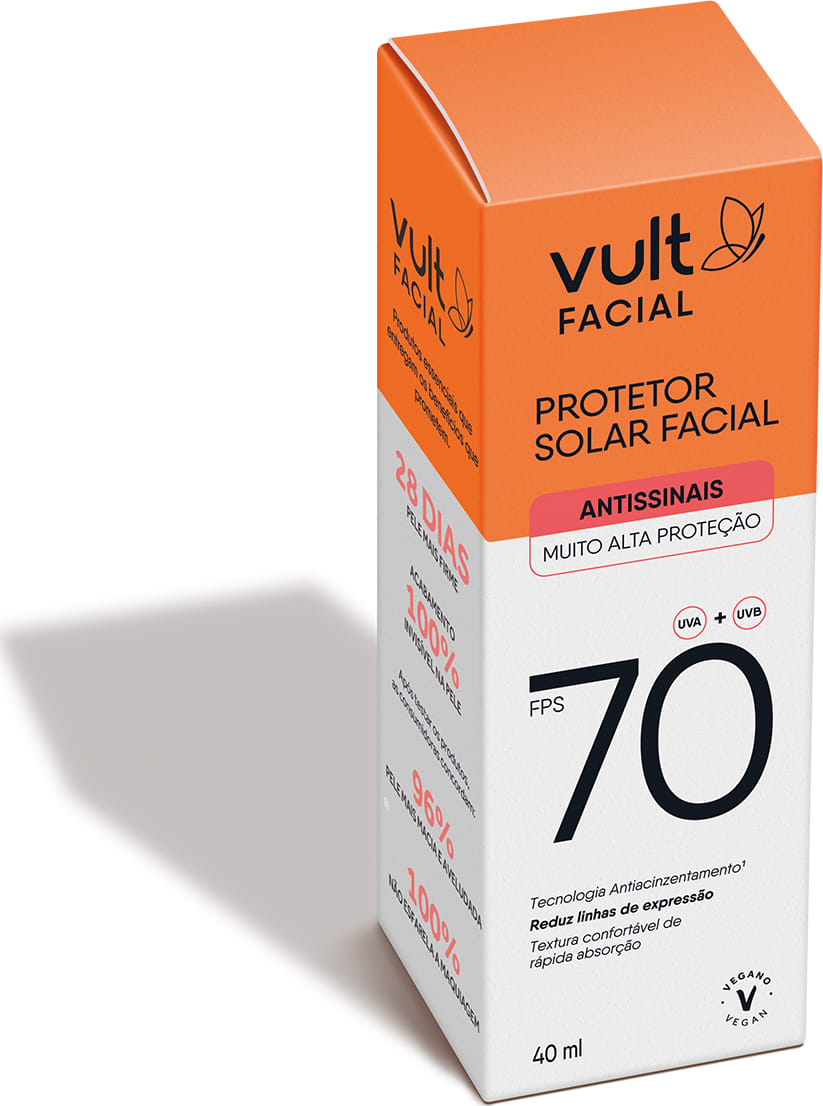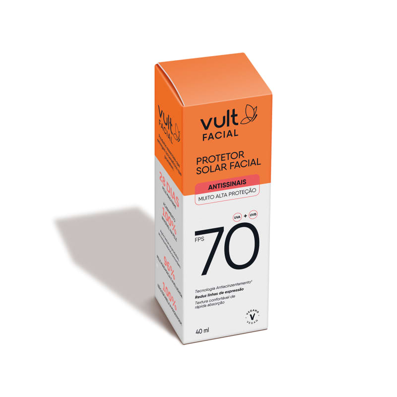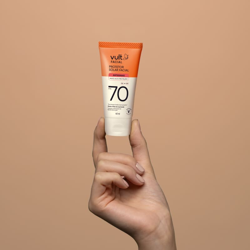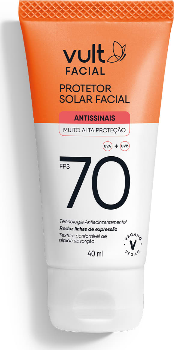 O Protetor Solar Antissinais FPS 70 Vult Facial, além de proteger a pele contra danos causados pelo sol, também reduz a aparência de linhas de expressão, deixando-a mais firme, com acabamento invisível.