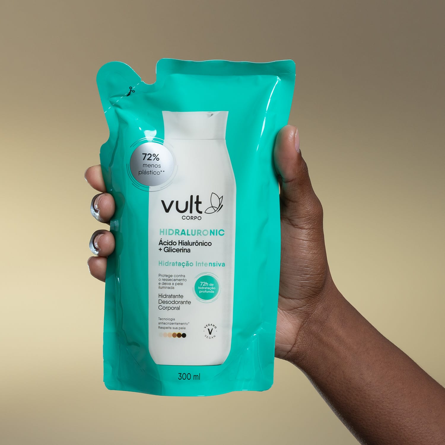 Vegano, o Refil de Hidratante Desodorante Corporal Vult Corpo Hidraluronic Hidratação Imediata cuida da sua pele por até 72h e tem 72% menos plástico em sua embalagem refil.