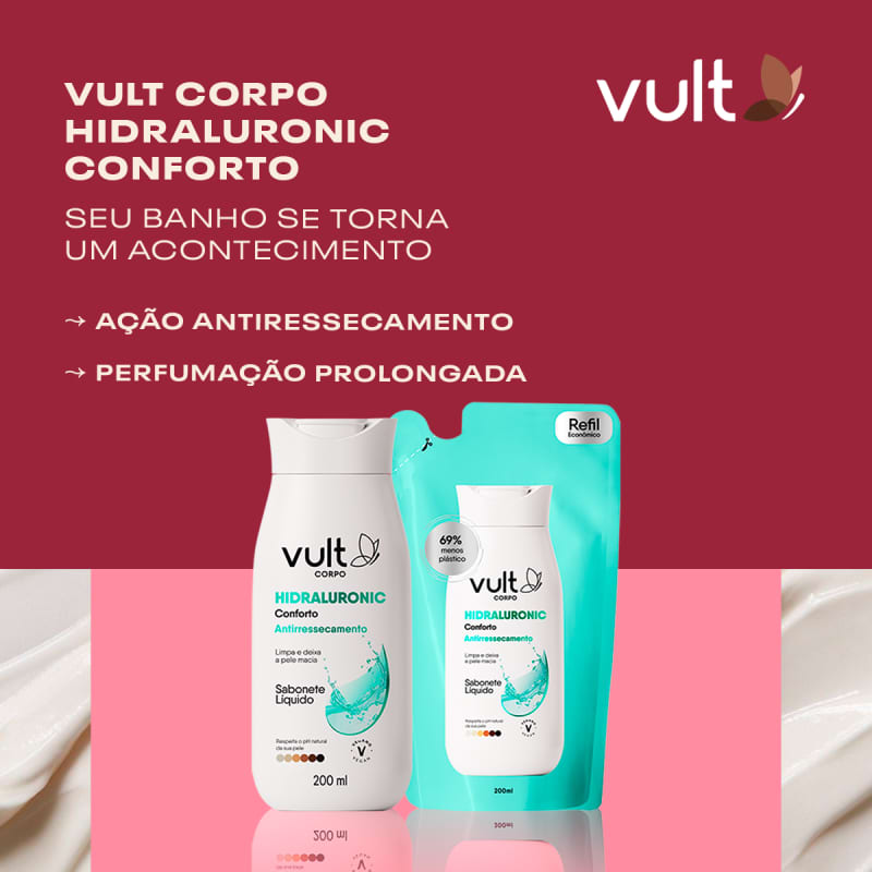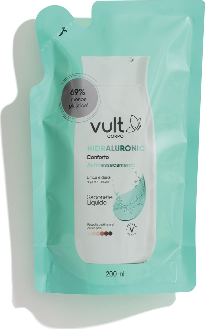 Vegano, o Refil Sabonete Líquido Antiressecamento Vult Corpo Hidraluronic Conforto proporciona uma pele limpa, macia, hidratada e exalando perfumação onde quer que você esteja e com 69% menos plástico em sua embalagem refil.