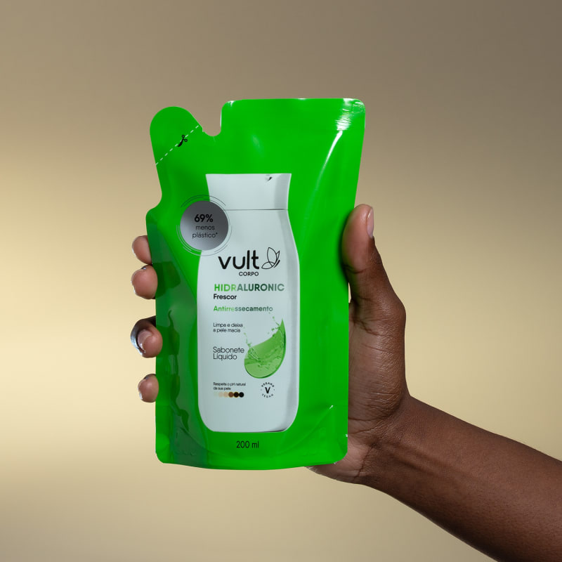 Vegano, o Refil Sabonete Líquido Antiressecamento Vult Corpo Hidraluronic Frecor proporciona uma pele limpa, macia, hidratada e exalando perfumação onde quer que você esteja e com 69% menos plástico em sua embalagem refil.