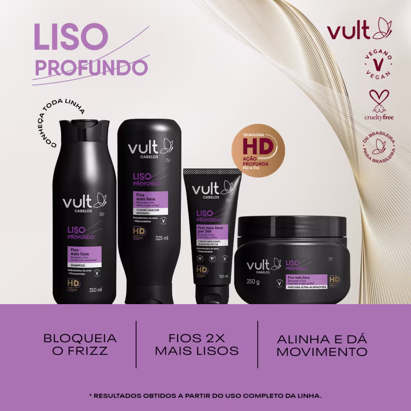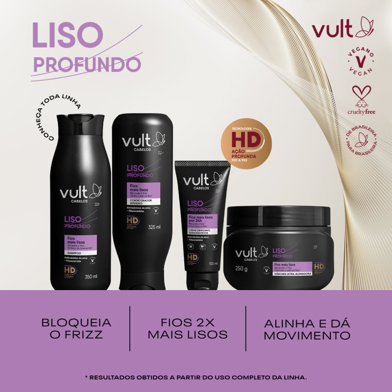 Quer fios mais lisos, sem frizz e com movimento? Vult Liso Profundo te ajuda a cuidar especificamente do seu tipo de cabelo, exaltando suas singularidades!