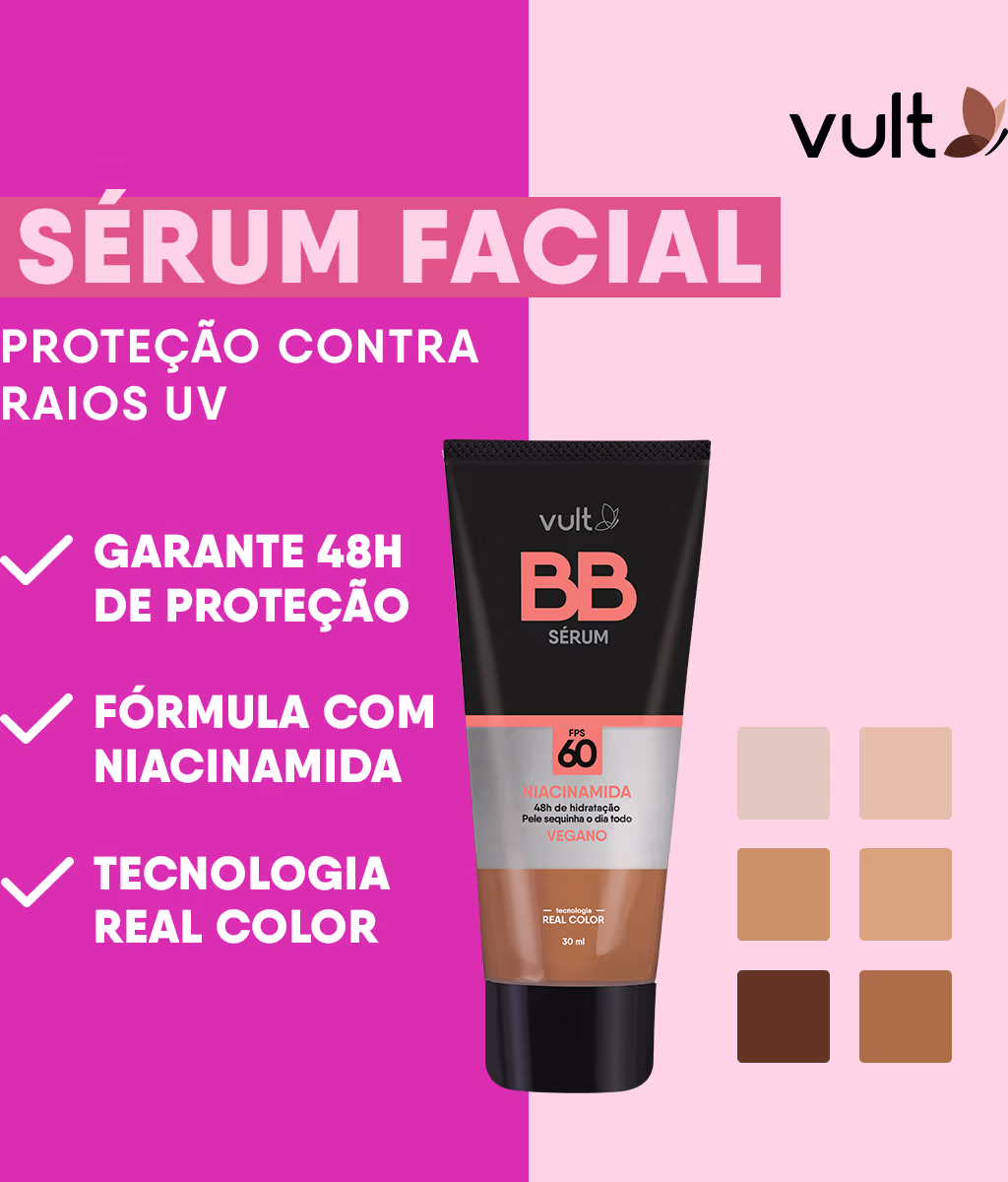 Quer um produto que hidrate, proteja e ainda dê uma cor que uniformize o tom da pele? Você vai adorar conhecer o Sérum Facial BB Cream FPS 60 V100! Este item multifuncional oferece vários benefícios ao mesmo tempo: