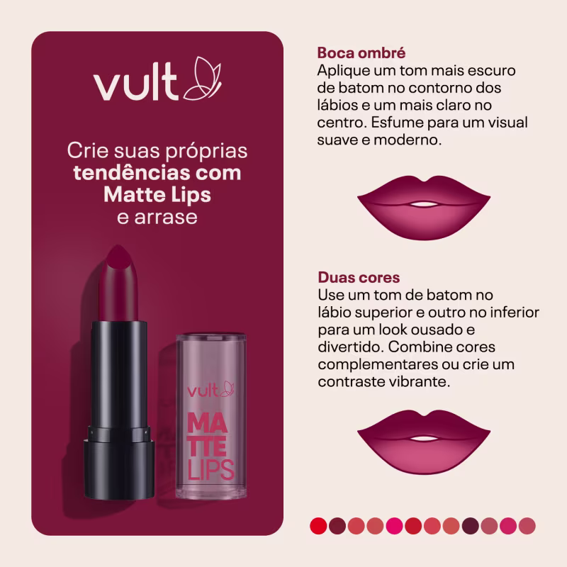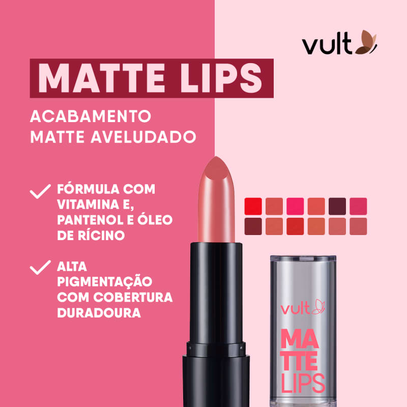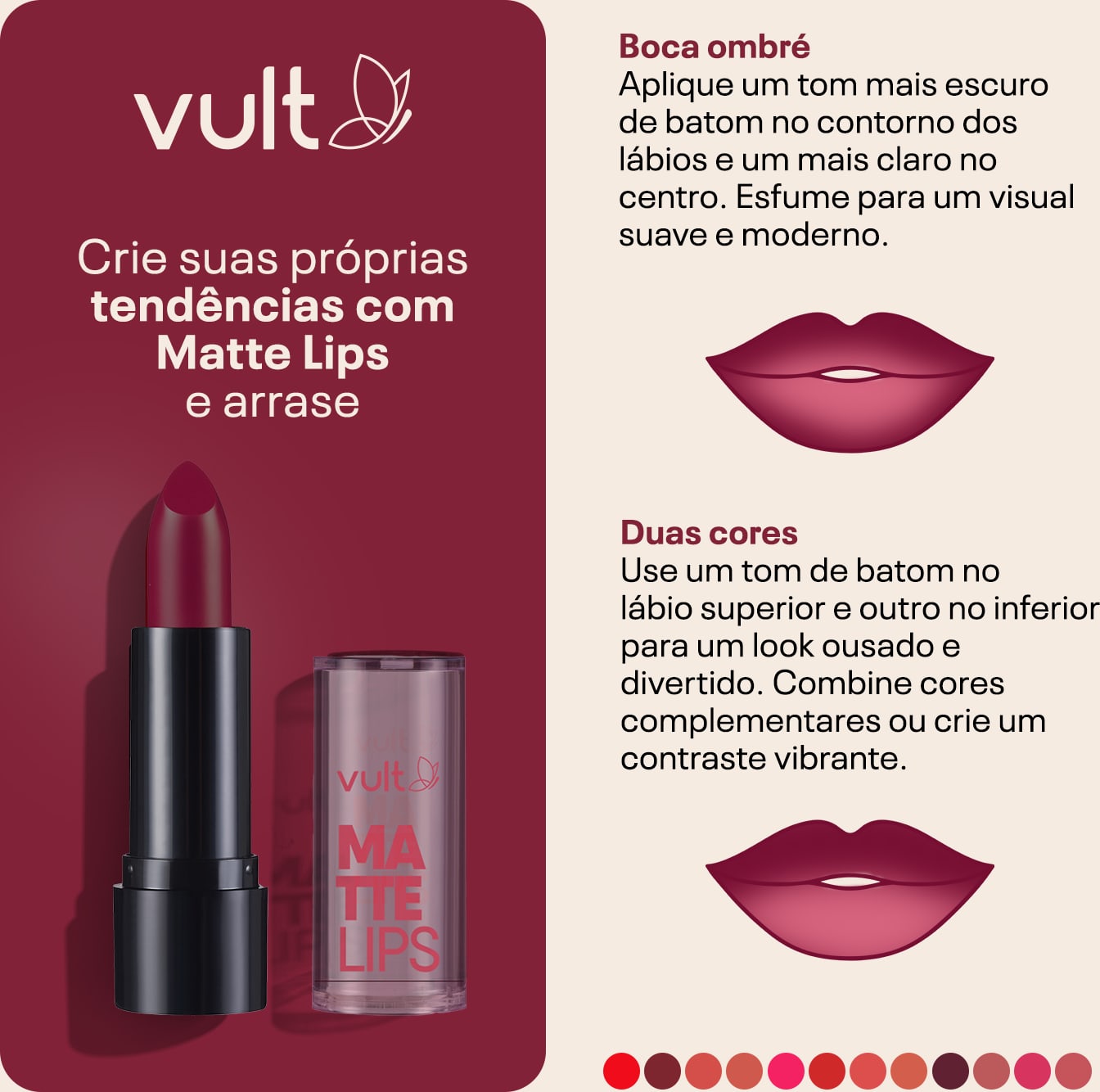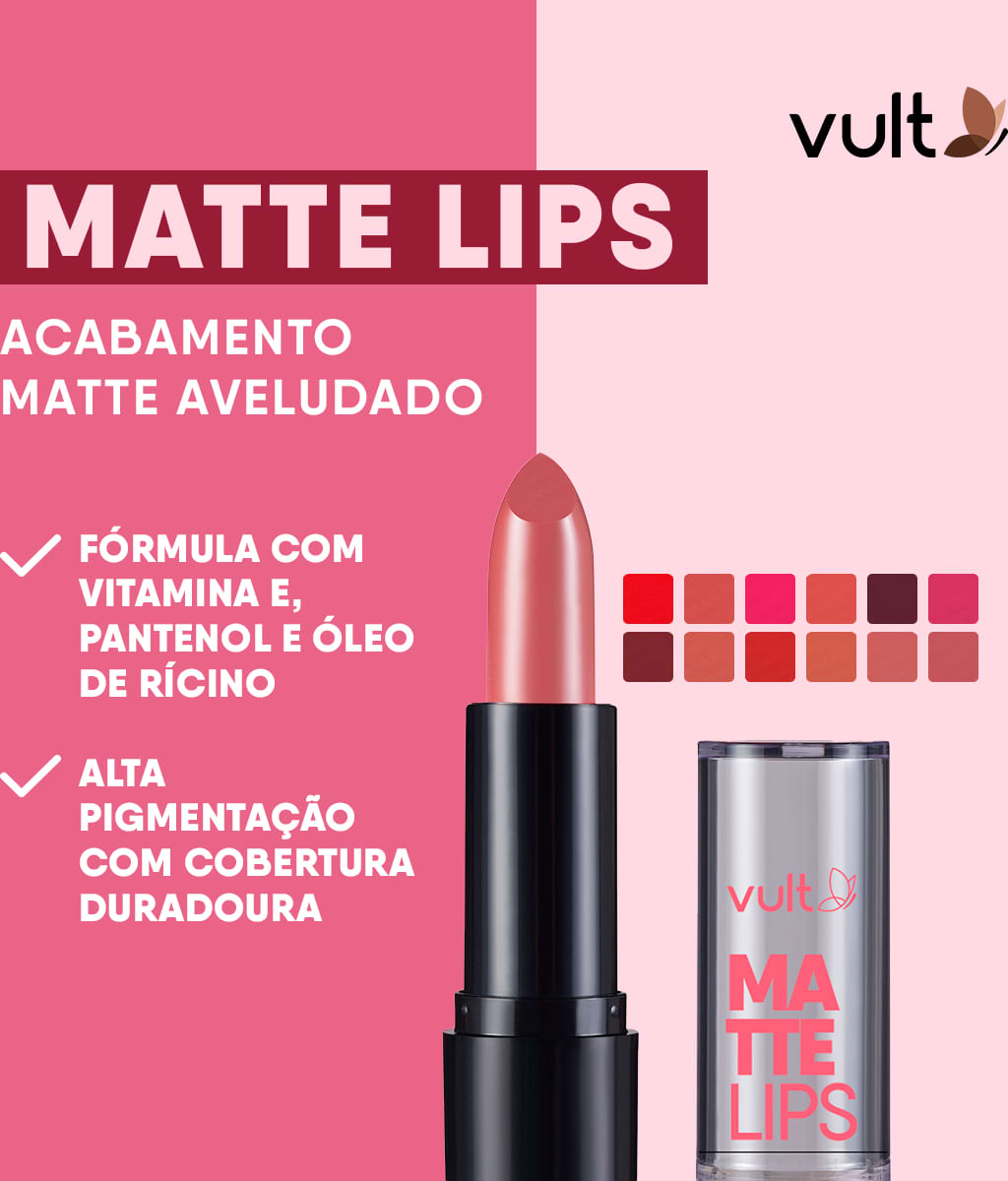 Conheça o melhore de Vult! Batom Vult Matte Lips. Sua textura confortável tem alta pigmentação e alta cobertura duradoura. Melhor preço Vult! Ver mais ❯